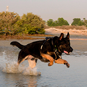 The neck is strong and muscular, clean-cut and relatively long, proportionate in size to the head and without loose folds of skin. Topline - The withers are higher than and sloping into the level back. The back is straight, very strongly developed without sag or roach, and relatively short. The whole structure of the body gives an impression of depth and solidity without bulkiness. Chest - Commencing at the prosternum, it is well filled and carried well down between the legs.. Ribbing is carried well back so that the loin is relatively short. Abdomen firmly held and not paunchy. Tail bushy, with the last vertebra extended at least to the hock joint. It is set smoothly into the croup and low rather than high. At rest, the tail hangs in a slight curve like a saber. The feet are short, compact with toes well arched, pads thick and firm, nails short and dark.